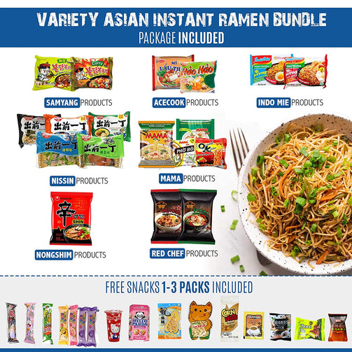 - 🍜The Variety Asian instant ramen 10 pack includes: Samyang, Nong-shin, Nissin, Red Chef and Mama, Acecook & Mi Goreng