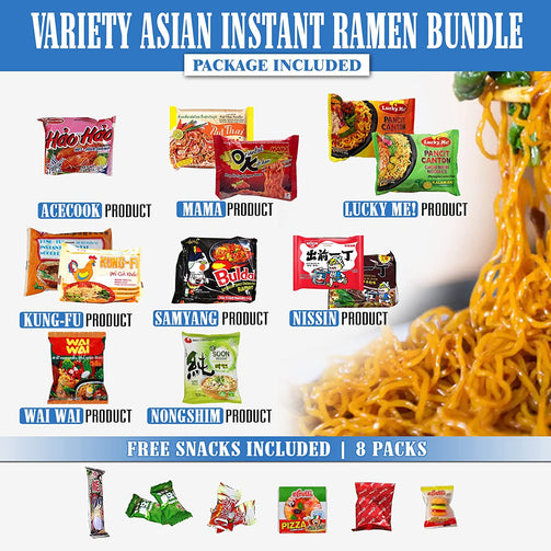 - 🍜The Variety Asian instant ramen 8 pack includes: Samyang, Nissin, Nong-shin, Mama, Ve Wong, Wai Wai, Lucky Me & Acecook.